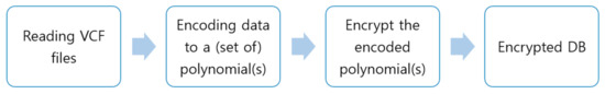 Hybrid HE(Homomorphic Encryption) [18,19] provides a method of encoding a large amount of data on the existing SWHE and a method of quickly searching for given data among the encoded data; it easily finds the associated data with the searched data. Hybrid HE methods have been proposed in order to quickly find specific genome sequences in large amounts of genome sequence information. In [18,19], the genome sequencing data are stored in files of variations call format (VCF). Figure 2 shows the method used to create an encrypted database from the genome sequence data.