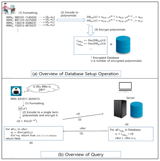 Figure 3 presents an overview of the proposed scheme. There are two actors in the system. One is the user who generates private, evaluation, and public keys using hybrid HE [18,19]. The public and evaluation keys are sent to the other actor, the server, which manages the encrypted database and performs query operations with the querying ciphertexts from users. The proposed scheme supports two operations: the database setup and query operation. Figure 3a shows the database setup operation. It consists of three steps. The first step is the formatting of the data. Each RRN is formatted to a number of ( pairs, depending on the number of databases (nDB) used. For simplicity, we assume that an RRN is formatted to a single ( pair. Subsequently, each (pair is embedded into a polynomial, which makes the coefficient of the dth term as .