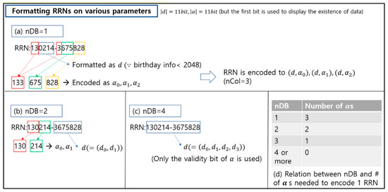 We provide details of how to format an RRN into a set of pairs in this subsection. We can choose different formatting strategies depending on the nDB value, as shown in Figure 4. Figure 4a shows the case where nDB is one. In this case, three s are required to represent one RRN. It is to be noted that both d and can contain up to 11 bits. However, to represent whether there is a value in the bit or not, the most significant bit of is used as a flag bit. Thus, each of three-digit numbers in an RRN are covered by each . In addition, the 3–6th digits of an RRN represent the birthday of the holder. Thus, this number is less than 2047. Therefore, we can contain those digits in d. Figure 4b shows the case of nDB = 2. In this case, there are two ds; hence, they contain up to 22 bits. Because the first digit in the second part of RRN can be only one of 1–4, all seven digits can be contained in two ds. Figure 4c represents the case where nDB = 4. In this case, all the digits in an RRN can be contained in the four ds, and we do not have to put any digit in the part. However, the most significant bit of is set to one to represent whether a given d value is used. Figure 4d depicts the relation between nDB and the number of values needed to represent an RRN. From the table, we can see that the maximum nDB that we need to consider is four.