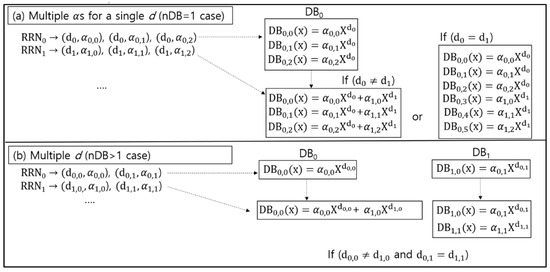 After formatting, the data are encoded to organize databases or to make a query. We focus on making databases with a large number of formatted RRNs, as the case of making a query is encoding a single formatted RRN. The encoding comprises two steps. The first step is embedding the formatted RRNs into polynomials. Figure 5 depicts this step. It shows that each pair constitutes a single term in a polynomial. In addition, at when the two pairs of formatted and are encoded, they are stored in two separate polynomials. Figure 5a explains the case when a single d is used with multiple . In this case, depending on the number of used, the number of polynomials that is newly created when two RRNs collide with regard to their d values is considered. Figure 5b deals with the case where two ds are used to format an RRN value. As fewer numbers of are mapped to a single d, the number of polynomials created in a collision, which is, the event that any of d in two RRNs is matched occurs is decreased.