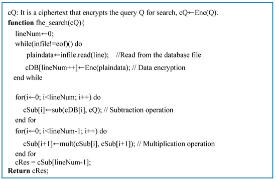 Owing to [18], we can perform such a search operation with an encrypted database and an encrypted query. After encrypting to Enc( and to Enc(), it is possible to perform multiplication with both ciphertexts in order to obtain the ciphertext of . Thus, we can obtain × which can be easily transformed to the search result after decrypting the ciphertext.