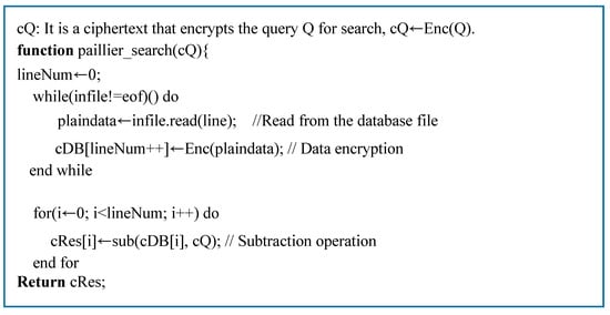We also implemented a search algorithm that could work with the Paillier cryptosystem, which is an additive homomorphic encryption algorithm, as shown in Figure 8. To implement this, we used Python-Paillier, an implementation of the Paillier cryptosystem [9] with Python language. Unlike the FHE schemes, the Paillier scheme does not support the multiplication operation of two ciphertexts. Here, the ciphertext obtained by subtracting the data to be searched and the data stored in the database are returned as a result. If there are data to be searched in the database, there is a 0 in the result ciphertext; if there are no data, there is non-zero value in the result ciphertext.