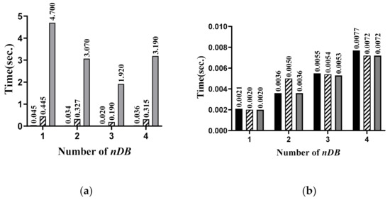 Encryption Execution Time: when the number of databases is 100,000, one million, or 10 million, the time that is required to encrypt the database where nDB is from 1 to 4 is shown in Figure 9a. It can be seen that, when the number of databases is 100,000, 1 million, or 10 million, encryption is performed fastest when the nDB is three.