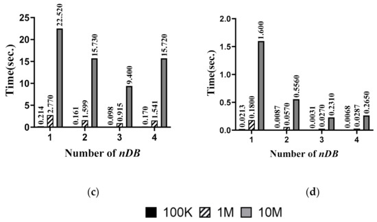 Result Decryption Time: when the number of databases is 100,000, one million, or 10 million, the time required to decrypt the result ciphertext where nDB is from 1 to 4 is shown in Figure 9d. It can be seen that when the number of data in the database is 100,000, one million, or 10 million, and when the nDB is three, the decryption is performed faster with a slight difference than in other cases.