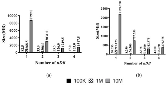 Size of Ciphertext for Database Representation: when the number of databases is 100,000, one million, or 10 million, the size of the ciphertext for the database where nDB is from one to four is as shown in Figure 10a. When the number of data in the database is 100,000, one million, or 10 million, and, when the nDB is three, the size of the database is the smallest.