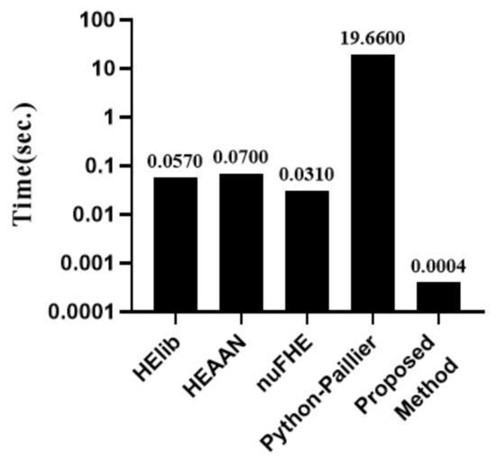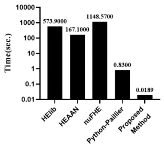 Search Execution Time: when the number of data points is 10,000, the time that is required for the search is shown in Figure 11. Among the methods to be compared, Python-Paillier is the fastest; however, the performance is approximately 43.9 times worse than the proposed algorithm.