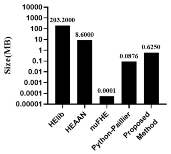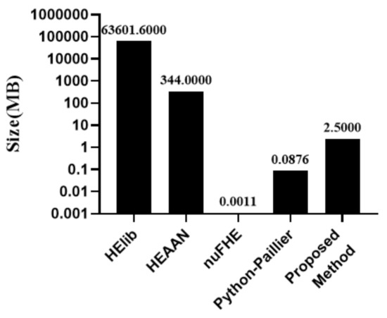 Size of Ciphertext for Database Representation: when the number of databases is 10,000, the size of the encrypted database of each method is shown in Figure 13. It can be seen that the ciphertexts of nuFHE are generated in the smallest size. The proposed algorithm is 2.5 MB, 250 bytes per record, and it can be considered to be practical.