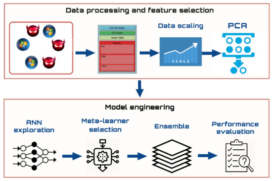 The phases involved in achieving the final solution are (1) data processing and feature selection and (2) model engineering, which includes the following steps: data selection and scaling, reduction in dimensionality, ANN model exploration and meta-learner classifier selection, ensemble model development, model testing and performance evaluation. Figure 1 indicates the flow to the model evaluation stage of the stages involved in the system methodology, beginning with data selection, which is described in more depth in the following subsections.