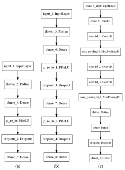 Example of architectures used as base learners: (a) Dense-1 network architecture, (b) Dense-2 network architecture and (c) 1D-CNN network architecture.