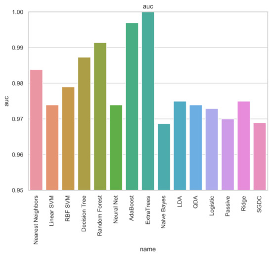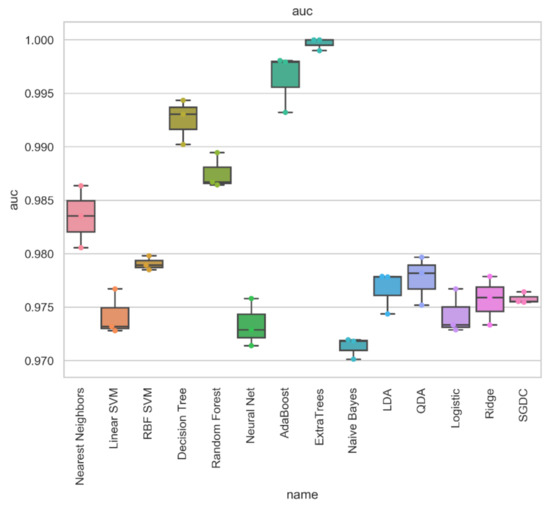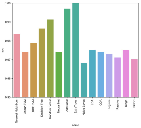 The role of the meta-learner is to find how best to aggregate the decisions of the base classifiers. As meta-learners, we explored K-Nearest Neighbors (KNN), Support Vector Machine (SVM) with linear kernel, SVM with radial basis function (RBF) kernel, Decision Tree (DT), Random Forest (RF), Multi-Layer Perceptron (MLP), AdaBoost Classifier, ExtraTrees (ET) classifier, Isolation Forest, Gaussian Naïve Bayes (GNB), Linear Discriminant Analysis (LDA), Quadratic Discriminant Analysis (QDA), Logistic Regression (LR), Ridge Classifier (RC) and stochastic gradient descent classifier (SGDC). Here, KNN is a model that classifies unknown input data based on having the most similarity (least distance) to known input data. SVM is a supervised learning method that constructs a higher dimensional hyperplane to separate input data belonging to various classes while maximizing the data input distance to the hyperplane. The DT classifier creates a decision tree by splitting according to the feature which has the highest information gain. RF fits many DT classifiers on different sub-samples of the dataset and uses averaging to improve the prediction accuracy. AdaBoost fits a classifier on the dataset and performs weighting of incorrectly classified instances to improve accuracy. Isolation Forest performs classification based on identified anomalies in data. GNB performs classification based on the probability distributions of features and classes. The ET Classifier [53] creates a meta-estimator that fits multiple decision trees on the training dataset sub-samples and uses averaging to improve precision and over-fitting management. The goal of LDA is to find a linear combination of input characteristics that distinguishes two or more input data groups. A quadratic decision surface is used by QDA to distinguish two or more groups of input data. LR is a linear regression-like statistical approach that predicts a result for a binary output variable from an input variable. RC converts the label data to (−1,1) and fixes the regression method problem. As a target class, the greatest value of prediction is admitted. SGDC is a learning algorithm for stochastic gradient descent that finds the decision boundary with a linear hinge loss.