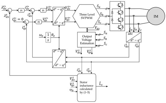 In the conventional system [16], the injected frequency () is fixed to 2 Hz in consideration of the no-load conditions during low-speed operations. Although the stator inductance identification based on this conventional low-speed rotational test is very accurate under variable load conditions with three-level NPC inverters, the accuracy is limited under standstill conditions because only variable loads can be considered as no-load conditions with this conventional method. Therefore, the estimation accuracy of the conventional identification method is not as good for constant torque loads or for locked-rotor standstill conditions. Moreover, the stator flux is only identified on the basis of the instantaneous reactive power and fixed frequency, which adds another inaccuracy to this identification method.