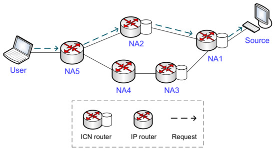 ICN supports the separation of identifier and locator. The user sends the request packet with a content name into the network, and the intermediate router which holds the corresponding content data immediately responds to the user via response packet. Consider a simple topology of a hybrid network of IP routers and cache-supported ICN routers, as shown in Figure 1 [33]. Supposing that a user requests content with its name, and the replica nodes holding this requested content include the content source and ICN routers (NA1, NA2, and NA3), then there are two main methods to retrieve this content. One is a happen-to-meet fashion like NDN, and the user will obtain the content data from the first replica node NA2, since it is on the transmission path to the content source. The other method is to use a GNRS to find all replicas and choose the nearest replica node as MF does, and the nearest replica node NA2 will be chosen as well. However, request packets from users connected to NA5 will always be forwarded to NA2 to retrieve content data, and replicas on NA3 will never be used. This may lead to high content download delay when the replica server at NA2 is in an overload situation or the available bandwidth between the link of NA2 and NA5 is very low. Therefore, in addition to considering the network distance, it is also important to consider load balancing between replica nodes and avoid data transmission on congested paths. Unfortunately, the optimal replica selection strategy from a global optimization view is an NP-hard problem [34] and is hard to realize in content retrieval scenarios in ICN.