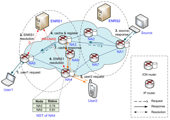 Figure 2 shows an overview of the ERS approach. The dotted oval represents the range of an ENRS domain based on distance constraints, and GNRS is usually deployed in the cloud and not drawn in this figure. Our replica selection method is supported by the late-binding technique [25] that any intermediate network nodes could initiate a name resolution request to the NRS and change the destination address of a packet in the hop-by-hop forwarding processes of this packet. A complete work process example of ERS is as follows: First, user1 sends a content request to an edge router at NA5 (step 1); NA5 sends a name resolution request with the content ID to ENRS1 to obtain the NA of the content replicas, but the query result is empty (step 2); thus, it sends a request packet to the content source, which is resolved by GNRS (step 3) and user1 can receive the response content. Meanwhile, this content is cached in NA1, NA3, and NA5 along the transmission path with the Leave Cache Everywhere cache algorithm [2,40], and the content name and these NAes are registered into corresponding NRS (step 4). Later, the edge router at NA4 receives a request for the same content from user2 (step 5); then, NA4 obtains NA3 and NA5 through name resolution by ENRS1 (step 6). Finally, the NST on the edge router at NA4 shows that NA3 has a better state with a smaller value compared to NA5, and the content request is responded to by the content replica on NA3 (step 7).