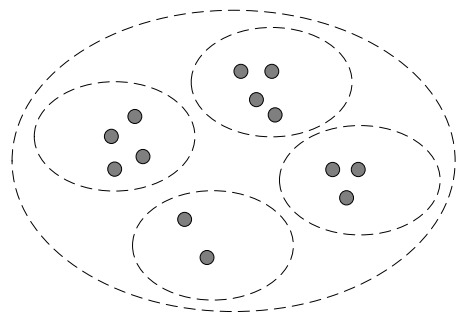 The structure of single-level ENRS. The grey points represent network nodes. The small dotted oval represents domains of ENRS, and the big dotted oval represents the domain of GNRS.