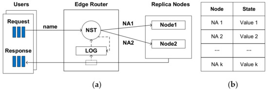 After obtaining the name resolution result from NRS, ERS uses NST to select the most appropriate replica node from multiple replica nodes holding the requested content. NST maintains the state of the replica nodes within the ENRS domain. The simple structure of the NST enables quick replica selection decisions with little effect on content download delay. Figure 4a shows that NST is maintained on the edge router locally. Because all the content requests from users and all the content responses from replicas have to forward across the edge router, the edge router has the ability to record each content transmission information in a local log file (denoted as LOG). This information for different content transmission processes can be easily distinguished by the name in the networking layer.