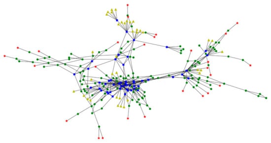 An Internet Service Provider (ISP) topology called TISCALI was generated by the Rocketfuel mapping engine [53] to run the simulations. TISCALI depicts the realistic Internet environment of Europe. As shown in Figure 5, this topology consists of 240 nodes and 404 edges, including 27 content sources (red star), 50 cache-supported ICN routers (blue square), 37 receivers (yellow triangle), and 126 IP routers (green circle).