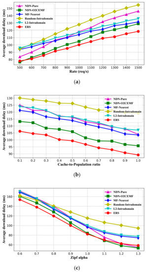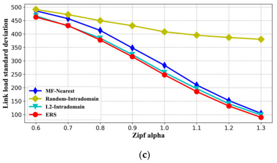From Figure 7a, we can see that as the request rate increases, the equilibrium of ERS and L2-Intradomain changes more smoothly than that of MF-Nearest and Random-Intradomain. This indicates that the state maintenance of replica node load in ERS can effectively prevent overloaded nodes from being selected. In Figure 7b, with the increase in the cache size, the load of the replica node declines at first and then starts to rise. The load first drops because the cache hit ratio is low when the cache size is small. At this time, most of the content will be served by content sources, and it causes loads of content sources to be very high. Then, the hit ratio of replica nodes in the network increases rapidly with the increase in cache size. The cache-supported routers can alleviate the load of the content source, and the equilibrium will be improved. However, each algorithm has a tendency to choose the closer copy. When the cache size becomes higher, the equilibrium deteriorates because the replica node near the receiver will be selected more frequently. The degree of request concentration corresponding to the alpha in Figure 7c is also closely related to the cache hit ratio. It also proves that the equilibrium deteriorates with the increase in cache size.