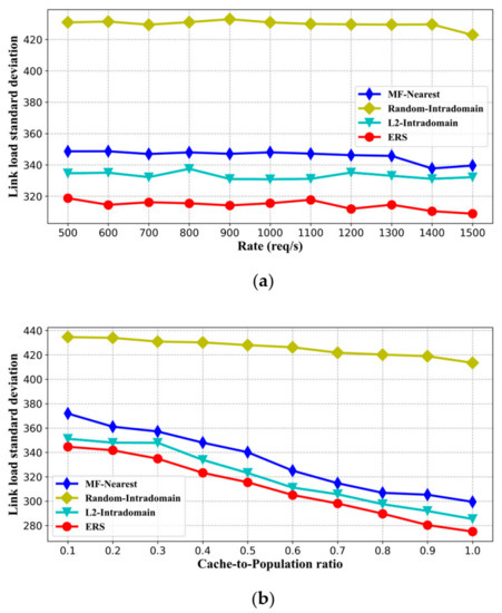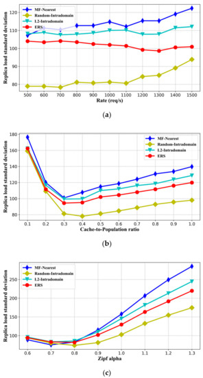 Balancing the service load of replica nodes can effectively avoid performance degradation caused by replica node overload. The standard deviation of replica node load is used to reflect the equilibrium of the replica nodes providing the content service. The replica node load represents the number of requests served by this node. We set up an experiment to study the load balancing of the methods based on the standalone name resolution, including ERS, MF-Nearest, L2-Intradomain, and Random-Intradomain. Similarly, we also explored the effects of the request rate, cache-to-population ratio, and Zipf parameter alpha. The simulation results are shown in Figure 7.
