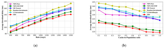 We also utilized the dataset of YouTube Video traffic to further verify the performance of our proposed method compared with others. The YouTube Video traffic records a total of requests [54] for videos, coming from 31,124 distinct IP addresses. Half of the total requests were used to warm up the network, and the remaining were used to gather statistics. Since the distribution of content requests has been fixed in the real-world data set, we only conducted comparative experiments on request rate and cache-to-population ratio. Figure 9 indicates that the performance of each algorithm running with the YouTube Video traffic dataset is basically the same as that of the stationary traffic shown in Figure 6. Different from the Zipf request distribution shown in Figure 6, we found that the NDN-Pure method declined more slowly as the cache-to-population ratio increased compared to other methods. This indicates that the NDN-Pure method is not making sufficient use of the cache in the YouTube dataset. However, the ERS method can still achieve the shortest average download time for the real traffic represented by this data set. Therefore, this experiment further proves the effectiveness of the ERS method for replica selection under different flow characteristics.