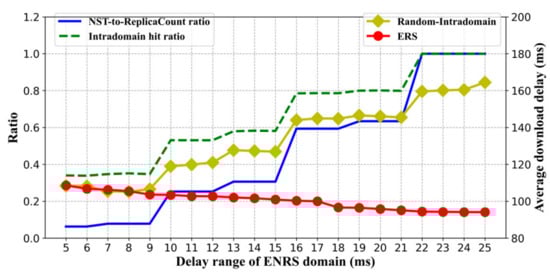 As mentioned in Section 3.3, the random method is recommended to adopt when the delay range of ENRS domain is small. This is because the random method is easy to implement and has low overhead. Therefore, the variation of the content download delay of the Random-Intradomain method with the increase in the delay range of the ENRS domain is also plotted in Figure 10. We can see that the average content download delay of ERS is almost the same as that of Random-Intradomain when the delay range of the ENRS domain is less than 9 ms, because there are only 1–3 replica nodes in each domain. Therefore, as mentioned in Section 3.3, a simple random replica selection strategy can be used when the delay range of the domain is small, i.e., less than 9 ms.