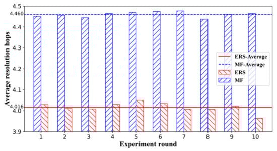 Authors in [55] confirmed that the cost of updating the control layer is much lower than the cost of data download, so resolution-based content discovery can be a good solution. As shown in Figure 11, the average resolution hops for each content retrieval of ERS is about decreased by 9.96% compared to MF. Furthermore, authors in [19] claimed that the GNRS update traffic only takes up a minute fraction of the overall Internet traffic. Thus, the name resolution traffic introduced by the ERS is acceptable. As described in Section 4, the state of replica nodes is obtained by recording historical transfer information, rather than active probing, which avoids introducing additional traffic overhead. From the experiment results in Figure 10, ERS can achieve a high in-domain hit ratio at a lower maintenance cost, so maintaining the data structure of the NST table in a reasonable range of domains does not cause a significant burden on memory.