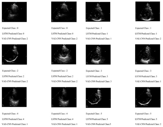 Two methods, namely, LSTM and VAE-CNN, are used for comparison purposes. It was not compared with other methods as no such work has been done in the same field using video. These two methods were used to check the applicability of deep learning methodologies in these fields. From the output obtained in Table 4, Table 5 and Table 6 and graphs in Figure 16 and Figure 17, it could be seen that classification into normal or abnormal gives very accurate results for both the methodologies in the training and validation phase. When it comes to prediction using VAE-CNN, a better result is obtained. Both cases under performed as accuracy during prediction could not be more than 80% in the case of two-class classification. Nonetheless, it can be observed that deep learning methodologies could classify correctly with the highest of 100% accuracy during validation and 95% accuracy during testing/prediction in six-class classification using LSTM. It can also be observed from the output in Figure 18, Table 6, Table 7 and Table 8, and graphs plotted in Figure 19 and Figure 17 that classification into 6 types of regurgitation give better accuracy and overall performance than that of normal or abnormal classification. This is due to the higher similarities pattern between classes. Few examples showing classification into six-class regurgitation can be seen in Figure 20.