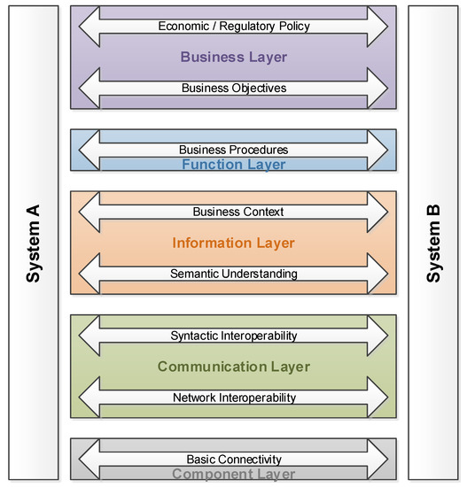 In the smart grid domain, several proposals for organising ICT contributions have been made. The 3-dimensional smart grid architecture model (SGAM) model [22] is probably the most popular among these structuring meta-models. It includes not only interoperability layers but also zones (which refer to the parts of the automation pyramid) and domains (which incorporate the electricity grid’s value-chain from bulk generation to customer premises). An older model for interoperability layers (1-dimensional, but more granular) is the “Gridwise interoperability context-setting framework” [23] from the GridWise architecture council (GWAC). Figure 1 shows a comparison of these models. The lower layers of these models (up to the “Semantic Understanding” GWAC layer) are furthermore covered by the International Organisation for Standardisation (ISO) open systems interconnection (OSI) reference model [24] for computer networks.
