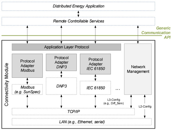 In case such RCSs want to communicate with other RCSs on different IEDs, the SmartOS has to provide the connection to a remote IED via an appropriate connectivity module. Figure 5 shows the respective module for external communication in the context of the overall system architecture depicted above. One of the main goals of the proposed architecture is to provide flexibility with regard to the integration of different smart grid-related protocols since there is currently no unified solution available. Typically, protocols, like Modbus, DNP3, or IEC 61850, are used, and the proposed approach allows to integrate all of them concurrently, as depicted in Figure 5.