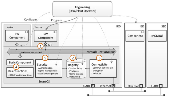 The core subsystem of the SmartOS is the “virtual functional bus (VFB)”, which provides intra-IED communication for different RCSs denominated as “software components”. This is done via the specifically developed OpenALP (see Section 4.3). Furthermore, the VFB connects the SmartOS modules, which are described in more detail in Section 3.3.2. The numbers shown in Figure 6 relate to the interfaces provided by the VFB. As only exception, interface 4 connects the basic component (which is a pre-defined software component encapsulating direct hardware access) to its respective basic functions, i.e., sensor and actuator access. To fulfil the requirements, the VFB needs to provide an ecosystem which is acting as a message oriented middleware (MOM) designed for a highly distributed environment.