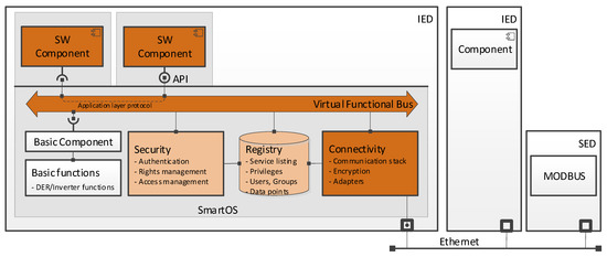 An overview of the software within one IED is given in Figure 6. Each IED contains the SmartOS middleware, which serves as container for hardware control (e.g., access to sensors and actuators), connectivity (communication to other IEDs), and security (especially access control to restrict functionality to users with respective rights), as well as a registry for services (in an OSGi-like manner) and users (based on LDAP [40]). Despite its name, the SmartOS, thus, actually constitutes a middleware rather than an operating system (OS).