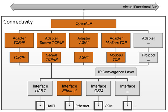 IEDs may communicate with other IEDs or RTUs via the connectivity module, using various kinds of protocols. The connectivity module has the ability to establish new connections or handle in-coming messages from established servers (instantiated by the VFB) via communication technologies, such as Ethernet, serial connections, or field busses, like controller area network (CAN) bus. To do this, the connectivity module is aware of the necessary adapters and protocols; these are determined via registry entries. Furthermore, adapters are implemented in a way to allow non-blocking operation and multiple simultaneous connections, if the respective protocols require such functionalities.