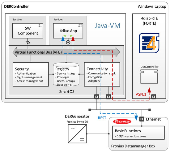 Based on the aforementioned requirements, a prototypical solution has been designed and implemented in order to serve as a proof-of-concept. The overall system architecture of this prototype is depicted in Figure 4. Hereby, the power flow (solid lines) and the data flow (dotted lines) between different intelligent electronic device (IEDs)—be it transformers, DERs, remote terminal unit (RTUs), or any other kind of IED—are visualised. Each IED comprises hardware and a middleware named “SmartOS”, as well as “remote controllable service (RCSs)”. The SmartOS again contains hardware control, security and access management, as well as connectivity functions. The RCSs access the middleware via a defined API only, and again provide functionality, such as voltage measurements, needed by smart grid applications, like Volt/var control. These services have been designed to run in sandboxes; thus, they can communicate with their environment only via the middleware.