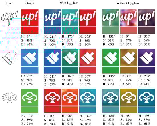 - Constrain the loss function of our network.In our method, is used to increase the variety of logo color. On the basis of increasing the diversity of training samples, we can increase the weight of in our loss function to expand the color diversity of network output. Thus, the color of the logo images can be enriched.