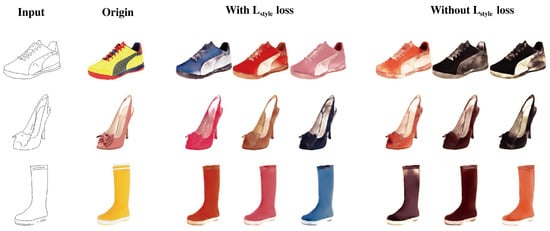 A new style loss function is added in this paper to ensure that multiple Att-UNets can output images with diverse colors. We designed a comparison experiment of two training modes, one with a style loss function and the other without. To make a fair comparison, all models use the same architecture, including a generator consisting of three Att-UNet blocks and a discriminator network with an output size of . We conducted training and testing based on edges2logo and edges2shoes datasets, respectively. The comparison results of the two mode on the testing set are shown in Figure 3 and Figure 4. From the comparison of the images of the two modes, it is observed that the model with loss produces higher color lightness. The color is purer and more uniform. In addition, the psychological feeling is sunny, happy and comfortable.