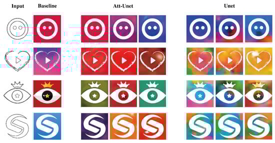We integrate spatial attention and channel attention in the U-Net structure to produce more realistic and beautiful logo color. To analyze the advantages of attention mechanism in Att-UNet structure, we compared the generated images of U-Net and Att-UNet.