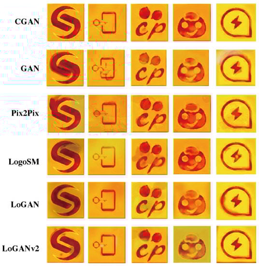 For the second set of experiments, the performance of our network was compared against Pix2Pix [20], LogoSM [17], LoGAN [18] and LoGANv2 [19]. We selected some representative images for comparison. Since our network can output three images for one sketch, so we manually select the most ideal image for comparison. The generated results and their heatmaps are given in Figure 6 and Figure 7, respectively.