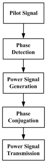 Figure 3 shows algorithm for digital retrodirective method. For no deformation case and deformation case, phase of pilot signal is determined. Then, power signal for required frequency is generated. Phase of the power signal is determined by converting phase of pilot signal to the power signal frequency, as shown by Equation (1). After that, Conjugation for the power signal phase is performed, and power beam is transmitted.