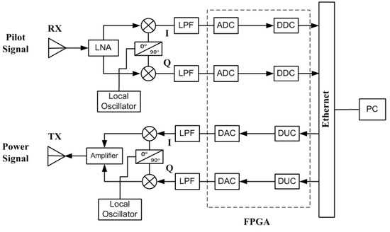 There is a concern that aliasing can occur when using different frequencies for power signal and pilot signal. It is described in Section 1 that 5.8 GHz and 2.45 GHz frequencies are proposed for power signal and pilot signal, respectively. Aliasing can take place when reconstructing power signal from samples of the pilot signal. In the proposed method, power signal is generated by SDR hardware and phase information of pilot signal is used for getting phase of power signal, as given in Equation (1) and represented by Figure 2, Figure 3 and Figure 4. So, aliasing will not occur for the proposed method with using different frequencies for power signal and pilot signal.
