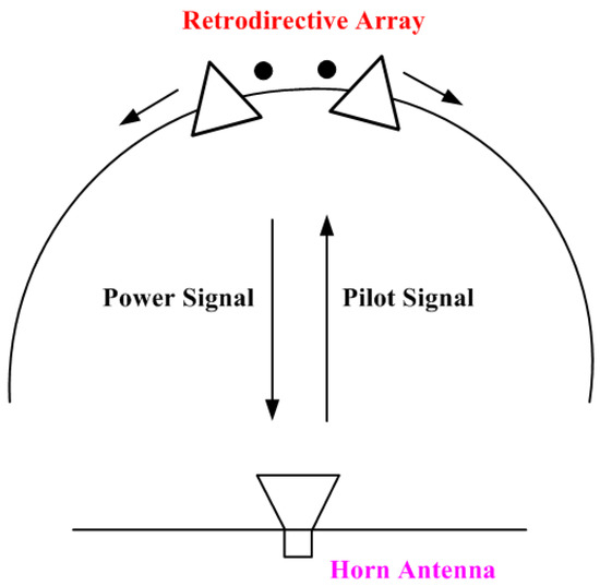 Figure 2 represents concept of digital retrodirective method. Pilot signal is sent from rectenna towards retrodirective array. Retrodirective array consists of pilot signal receiving antennas (RX) and power signal transmitting antennas (TX). is phase of pilot signal, received by RX1 and is phase of pilot signal, received by RX2. Phase detection of pilot signal is performed by DSP circuit. Then, DSP circuit performs beam forming for power signal by phase conjugation of pilot signal and considering frequency of power signal. Phase of the power signal () is determined by Equation (1):