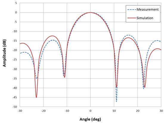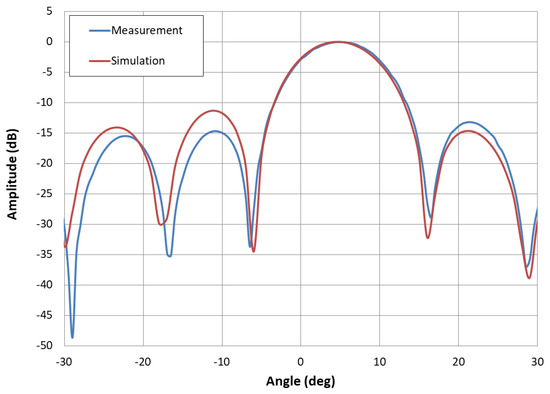 Digital retrodirective method is confirmed for beam forming towards 0 and 5. Pilot signal is sent towards 0 and 5 positions of retrodirective array. Figure 10 represents radiation pattern of power signal for 0 beam forming. Radiation pattern is measured from −30 to 30. Three decibels beam-width is 9.8 and side lobe level is −13 dB. The measured pattern, especially the main lobe matches those simulated closely. Simulations are performed by using CST software. Figure 11 shows radiation pattern of power signal for 5 beam forming. Half power beam-width is 9.5, and side lobe level is −12 dB. Simulated and measured results are in good agreement and represent that digital retrodirective method is performing well.