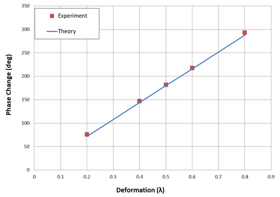 For deformation cases, analysis is performed for phase change of pilot signal with deformation. Figure 12 depicts comparison between theoretical data and measured data. Theoretical data is obtained by Equation (2):