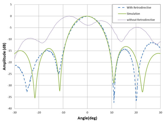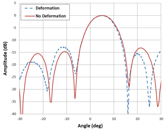 Figure 16 represents radiation pattern for 0.5 backward deformation case. With retrodirective plot correlates with the simulation, having beam-width of 9.7 and side lobe level of −12 dB. Without retrodirective pattern has −5.1 main lobe direction of and −3.4 dB side lobe level. Figure 17 depicts comparison of digital retrodirective method for no deformation and deformation case. Pilot signal is sent from 5, and measured patterns are compared. Both plots are in good agreement, and this shows that effect of antenna deformation is resolved successfully by digital retrodirective method.