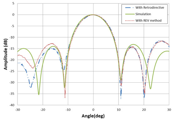 Figure 15 represents comparison of digital retrodirective method and REV method for antenna deformation. We compare the 0.5 deformation case, and the radiation pattern shows that both methods are in good agreement with the simulation. REV method takes long time for the process, so digital retrodirective method has advantage over REV method to correct radiation pattern for antenna deformation.