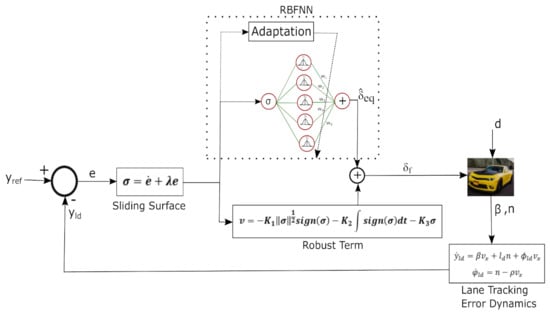 Here, represent the positive robust term gains to be designed accordingly. For this study, the gains associated with the HOSM controller are , , and , respectively. The higher the longitudinal speed, the higher the tire cornering force. The value of tire-force uncertainty , which is difficult to estimate, also changes with the change in the longitudinal speed and the road surface conditions. Thus, the term f in (8) that regulates the equivalent road steer angle is also difficult to estimate as it consists of the tire-force uncertainty term. The dynamics of crosswinds and the yaw-moment also depend on the longitudinal speed of the vehicle. The higher the speed, the greater the lateral force and yaw-moment impacted on the vehicle. To address the above challenges and its impact on the lateral control of the vehicle, an adaptive HOSMC based on RBFNN is proposed for effective lane-keeping and stability of the vehicle.