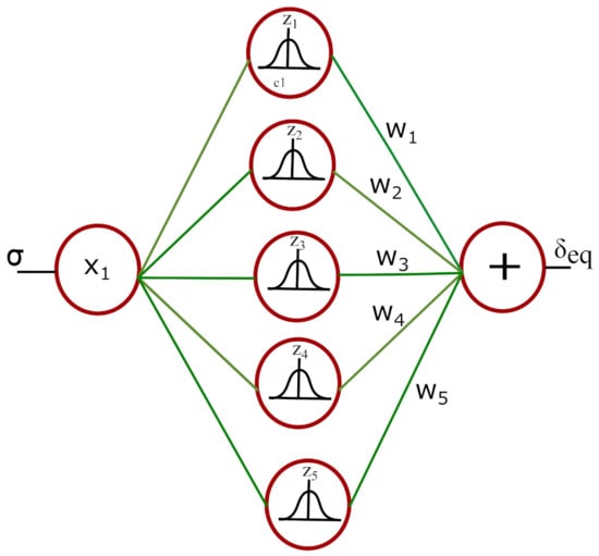 The structure of RBFNN with one input and one output with a hidden layer consisting of five nodes is shown in Figure 3. The design procedure of the proposed controller includes the estimation of using RBFNN. The input to this RBFNN structure is the sliding surface and the hidden layer consists of five nodes with a gaussian kernel, each one having a predefined center c and bias width b. The dynamics of RBFNN are expressed by