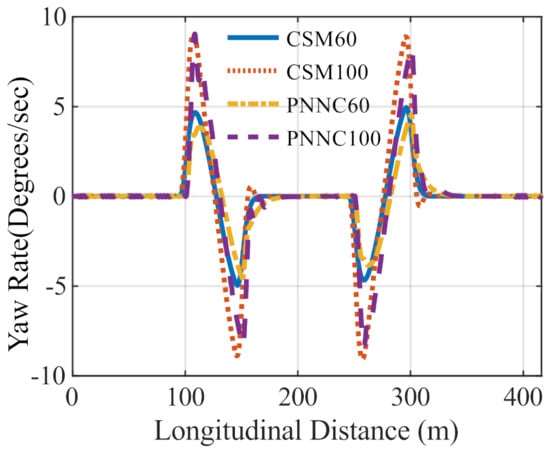 Yaw rate of the pure pursuit MPC controller (CSM) and the proposed Neural Network controller (PNNC) for = 60 km/h and = 100 km/h.