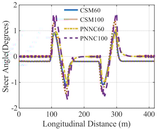 Road steer angle of the pure pursuit MPC controller and the proposed Neural Network controller (PNNC) for = 60 km/h and = 100 km/h.