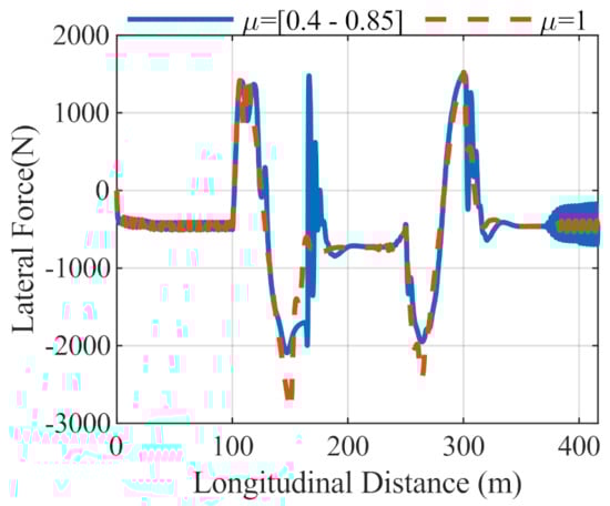 The peak value of the Lateral acceleration, as shown in Figure 8e, is 3.58 m/s , which states the fact that the vehicle operates in the region of the tire-road saturation limit. The deterioration in the lateral acceleration, during the case when –, occurs due to the impact on the lateral force component at low friction conditions, as shown in Figure 9.