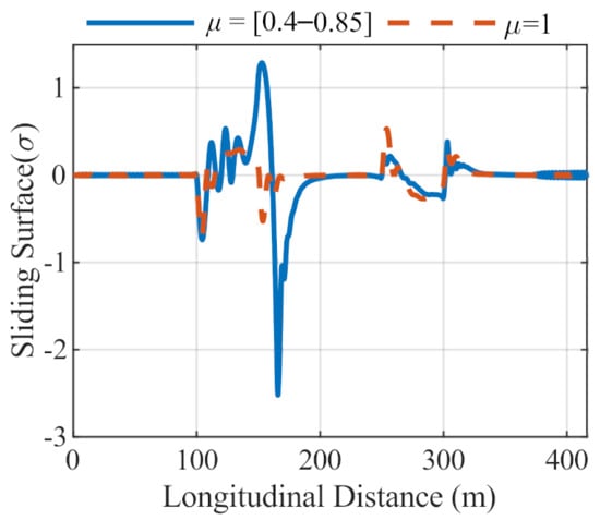 When –, the yaw-rate shown in Figure 8f shows the sign of distortion during the time when the disturbance begins and reaches a peak value of 10 degrees/s in the case of our proposed RBFNN-HOSM controller. However, due to the compensation provided by the proposed controller, the distortion in the yaw-rate gets stabilized at a longitudinal distance of 200 m signifying the regaining of vehicle stability. The effect of disturbances and the road-surface friction is witnessed in the road steer angle when –, as shown in Figure 8g, where there is a sharp increase in the steer angle during the time when the disturbance begins. On the contrary, when , there is a slight dip in the steering angle at the longitudinal distance of 150 m during the onset of crosswinds. However, the deviation in the steering angle when gets compensated due to the control action provided by the proposed controller. The peak value of the steer angle rises to -6 degrees, but after the compensation provided by the proposed controller, the road steer angle exhibits smoothness and uniformity afterward. The effect on sliding surface due to the crosswinds and the different road conditions is shown in Figure 10. The effect of low-friction is clearly evident on the sliding surface characteristics with a sharp spike at a longitudinal distance of 150 m when –.
