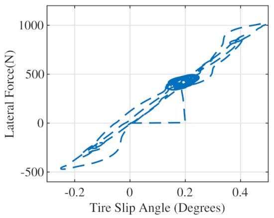 To further validate that the road-tire characteristics of the vehicle operate close to the region of saturation, the performance of lateral force on the vehicle is examined with respect to the tire-slip angle. In this study, the behavior of lateral force on the left front tire is examined with respect to the tire-slip angle. From Figure 11, it is observed that the road-tire characteristics exhibit the nonlinear behavior when the vehicle longitudinal speed is 100 km/h. In this case, the lateral force is saturated with the increase in the slip angle. However, at a lower longitudinal speed of 60 km/h, the tire road characteristics exhibit linear behavior, as shown in Figure 12.